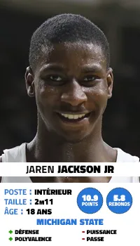 Sa saison freshman à Michigan State ne lui a pas permis d'exprimer totalement ses qualités mais les équipes sont enthousiastes, bien que Jaren Jackson Jr manque encore de puissance, ce qui l'handicape lors des batailles au rebond. On s'interroge aussi sur ses capacités de passeur, même si ce n'est pas ce qu'on lui demandera en premier.