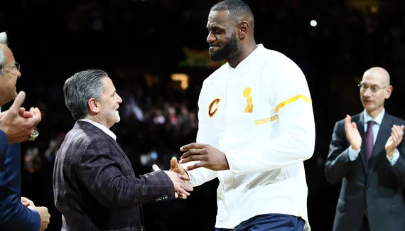 Rien de tout ça ne serait arrivé si LeBron James n'avait pas décidé de revenir chez lui, et de guider les Cavaliers vers la Terre promise. La franchise dans son ensemble remercie LeBron pour ce précieux moment, et pour toute la joie qu'il a apportée en menant notre équipe à quatre finales NBA de suite.