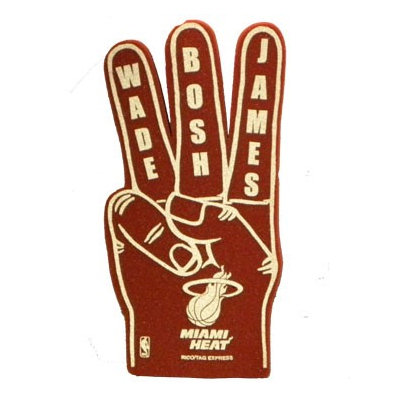 Le produit à la mode à Miami est le fameux « three finger foam » où figurent les noms de Dwyane Wade, LeBron James et Chris Bosh. Un gadget efficace à 10 $ qui réunit le trio magique (ou supposé comme tel…) sur les doigts de chaque fan.