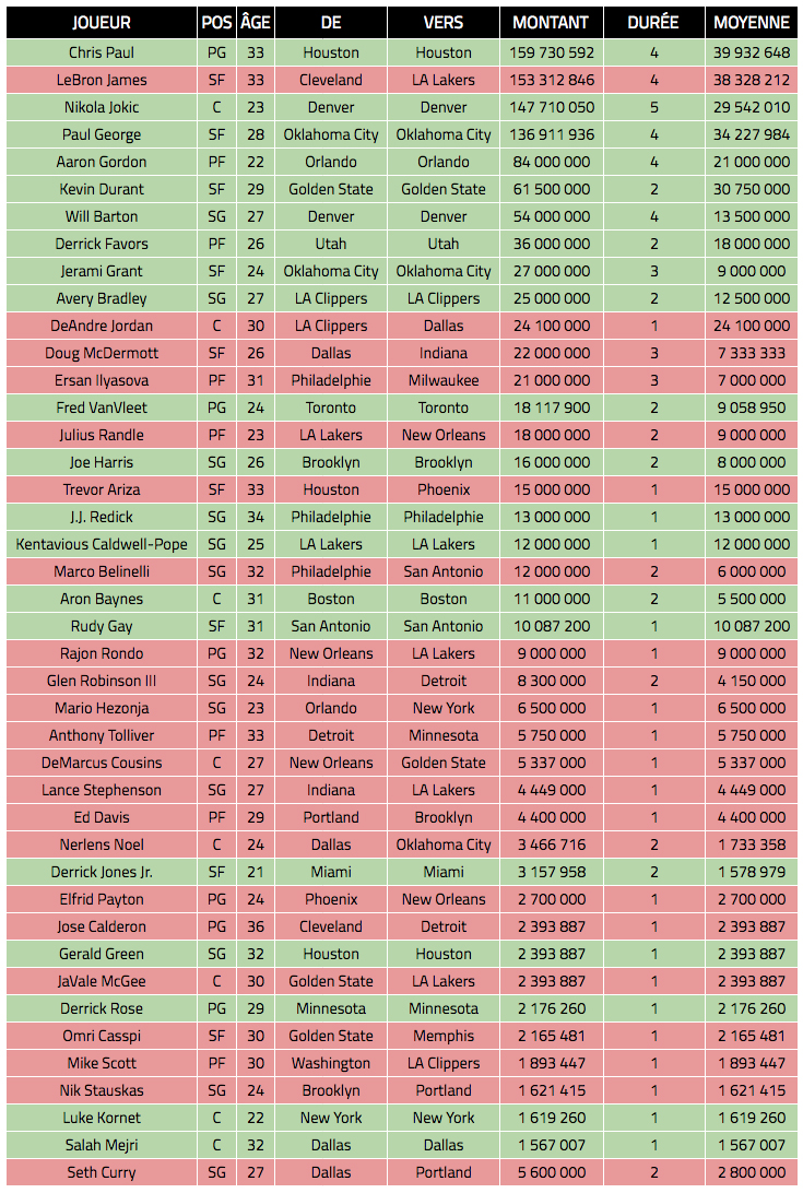 Suite à l’arrivée de LeBron James, ce sont les Lakers qui ont été le plus actif, en gardant Kentavious Caldwell-Pope puis en faisant venir Rajon Rondo, Lance Stephenson et JaVale McGee.