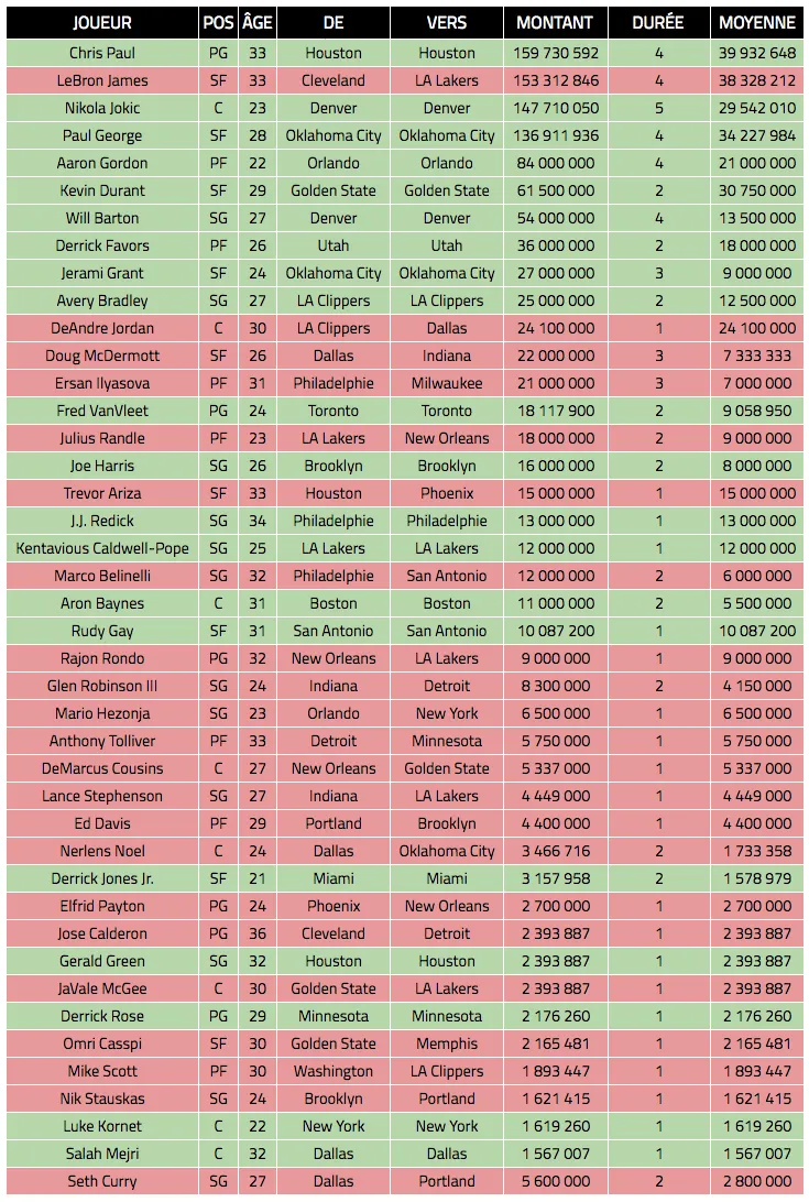 Suite à l'arrivée de LeBron James, ce sont les Lakers qui ont été le plus actif, en gardant Kentavious Caldwell-Pope puis en faisant venir Rajon Rondo, Lance Stephenson et JaVale McGee.