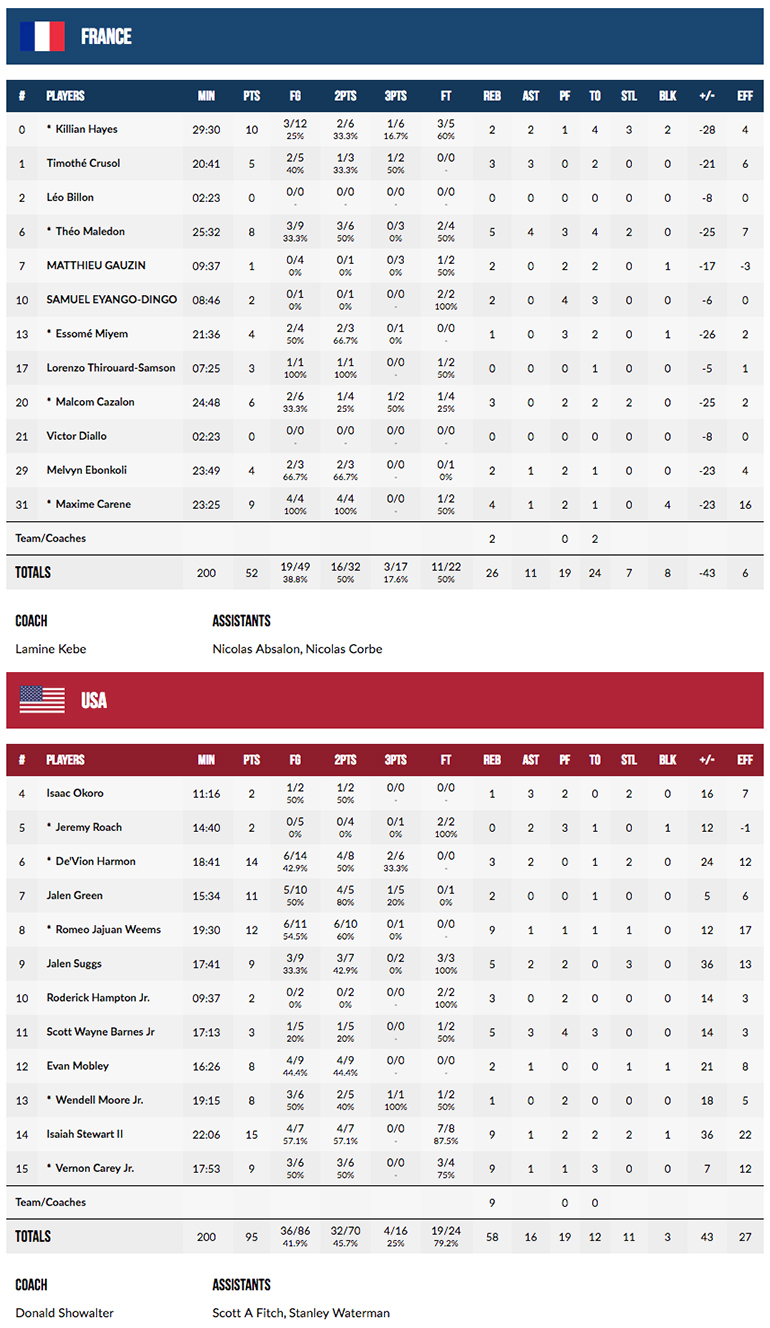 Pour la première fois en quatre éditions, la France monte toutefois sur le podium de l’épreuve alors que Killian Hayes (16.1 points par match) est élu dans le meilleur cinq de la compétition. Il est accompagné par deux Américains, le MVP du tournoi Jalen Green et Vernon Carey Jr, ainsi que le Portoricain André Curbelo et le Malien Oumar Ballo.