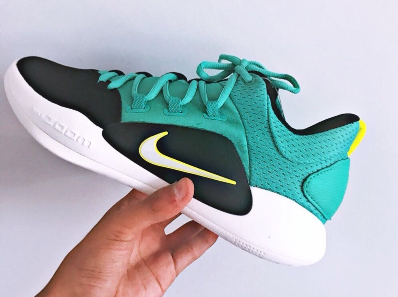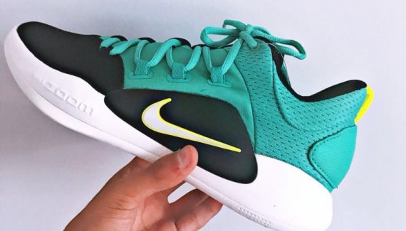 Un mois après avoir découvert les images officielles de la Nike Hyperdunk X, un visuel de la version basse a émergé sur le site Hupu, avec un modèle bleu-vert faisant ressortir les touches de jaune fluo qui lui sont apposées autour du Swoosh et sur l’arrière de la chaussure.