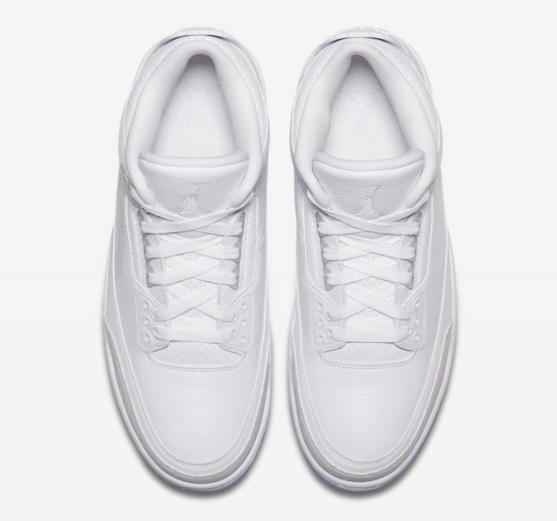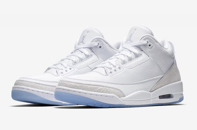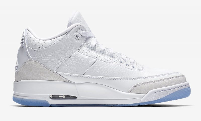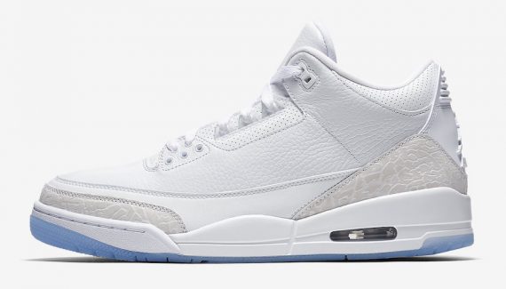 Triple dose de blanc pour la Air Jordan 3 Retro Pure White, déclinaison estivale du modèle mythique de Jordan Brand, qui perd ses deux logos éléphant mais gagne deux touches de cuir à l’avant et à l’arrière de la chaussure.
