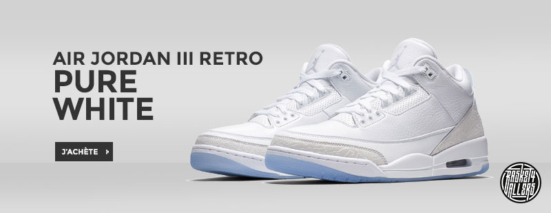 Commandez chez B4B la Air Jordan 3 Pure White qui associe la légendaire silhouette de 1988, l’empeigne entièrement blanche et la semelle extérieure coloris bleu glacé.