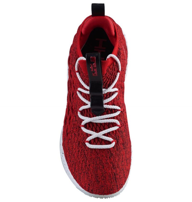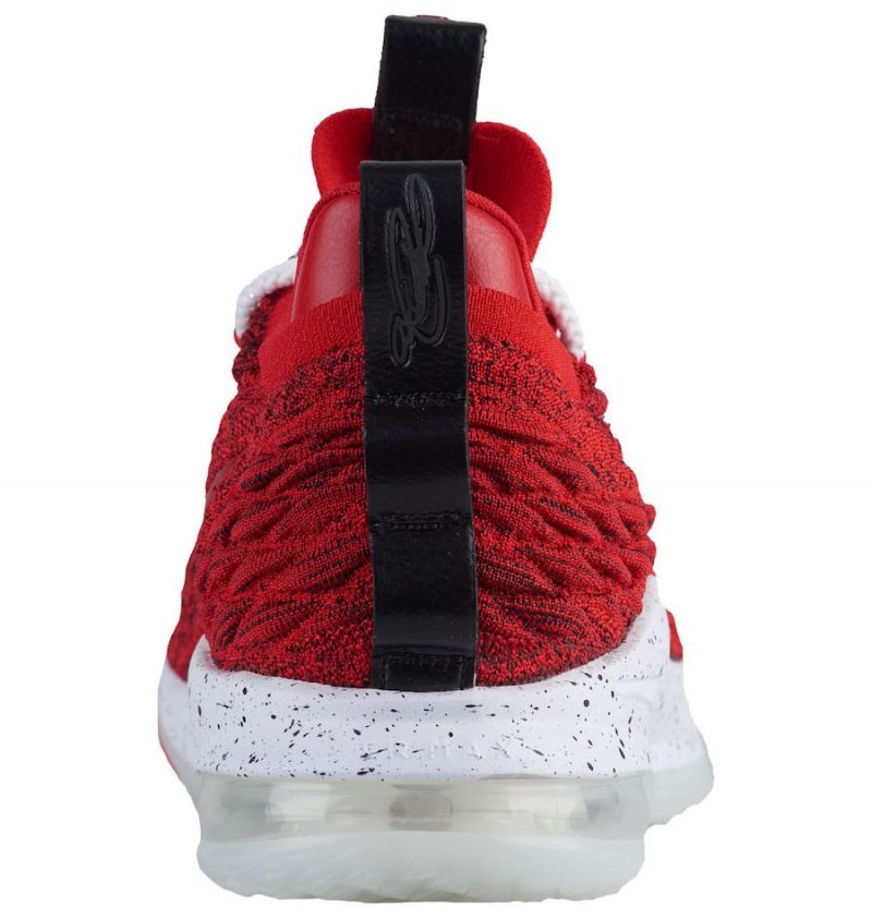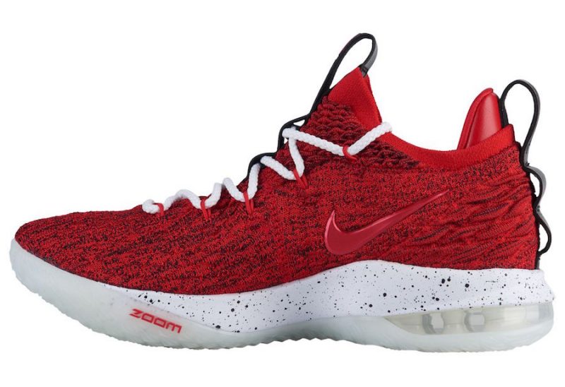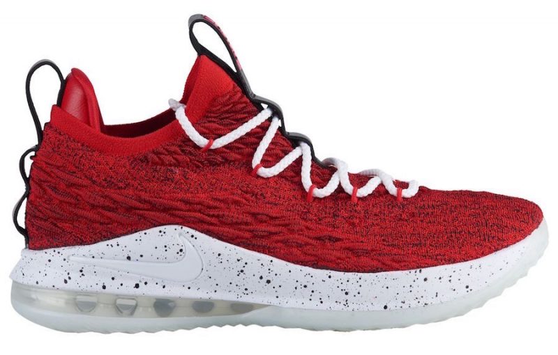 Du gris, du multicolore, et bientôt du rouge pour la LeBron 15 Low, qui sortira en version “Red University” le 1er août prochain, toujours au prix de 150 euros. Un rouge vif qui domine cette chaussure dont la partie basse est blanche mouchetée, avec une semelle translucide.