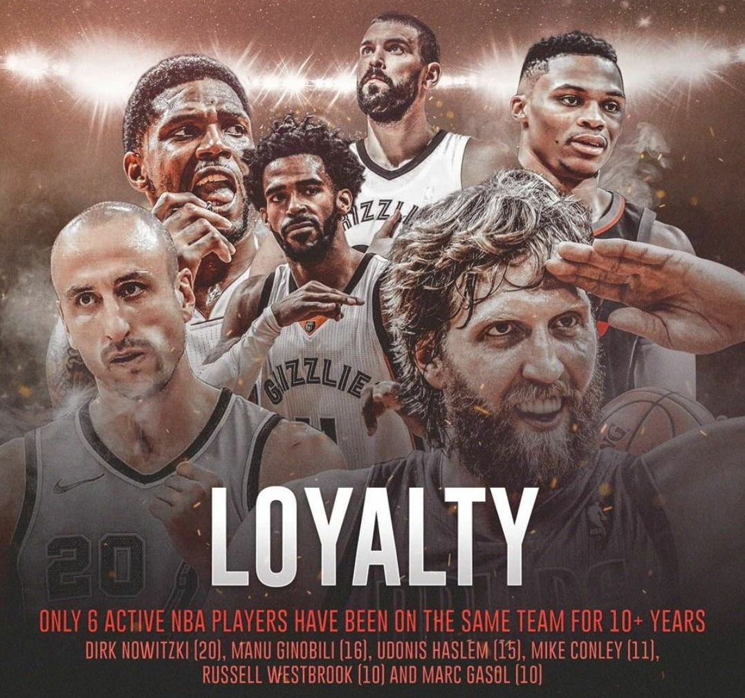 Pour souligner la loyauté exceptionnelle de l’Allemand envers les Mavericks, ClutchPoints a réalisé cette infographie, pour illustrer qu’il n’y a actuellement que six joueurs actifs en NBA qui ont passé plus de dix ans dans leur équipe originelle. Tony Parker parti à Charlotte tandis que Manu Ginobili et Udonis Haslem réfléchissent à une éventuelle retraite, ils ne seront peut-être que quatre l’an prochain : Dirk Nowitzki donc, Russell Westbrook, Mike Conley et Marc Gasol.