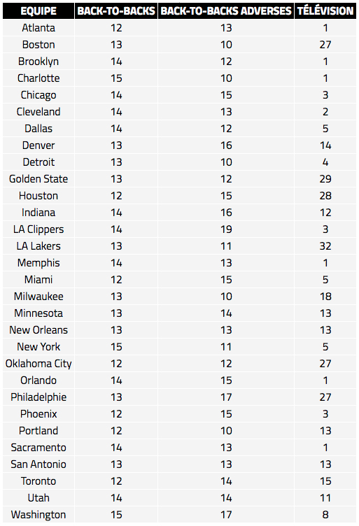 On l’a dit, la NBA a encore fait un gros effort pour réduire les back-to-backs, avec seulement 13.3 rencontres deux soirs d’affilée par franchise. Ce sont les Hornets, les Knicks et les Wizards qui en ont le plus (15) alors que les Clippers sont eux l’équipe qui affronte (19) le plus d’équipes en back-to-back.