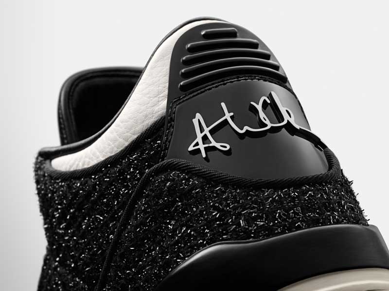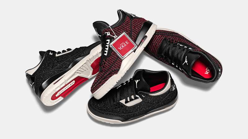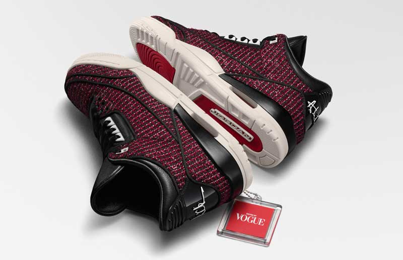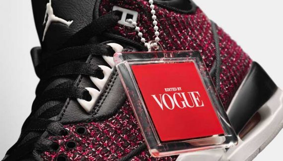 Sur la Jordan 3, on distingue une tige ornée de tweed, en clin d’oeil aux tenues de Wintour. Le côté premium est renforcé par le packaging, avec des petits pochons en daim pour chaque chaussure.