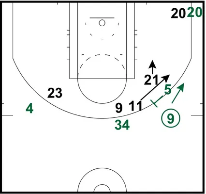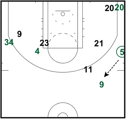 En conséquence, lors de la prise d'écran, Young aurait dû s'écarter de son joueur pour laisser passer Holiday entre lui-même et Garnett. Cela aurait permis au meneur de suivre son joueur de prêt et donc de ne pas réaliser la rotation “fatale”. La présence de Young sur le chemin vers le panier aurait aussi dissuadé Rondo de jouer en pénétration. Le schéma suivant représente ce qui aurait dû arriver.