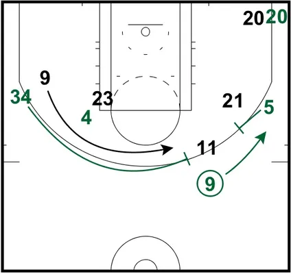 Allen est toujours dans le corner, et n'en bougera pas pour le reste de la séquence de jeu. Dangereux comme il est, il permet d'étirer la défense et de s'assurer que Jodie Meeks (#20) ne pourra pas couvrir ses coéquipiers.