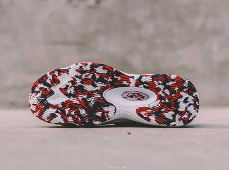 L’amorti est assuré par une mousse, et le tout est posé sur une semelle au motif marbré. Pas d’informations sur une éventuelle sortie européenne de cette chaussure aux couleurs des Wizards.