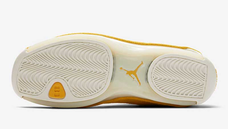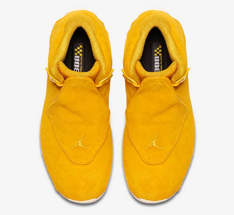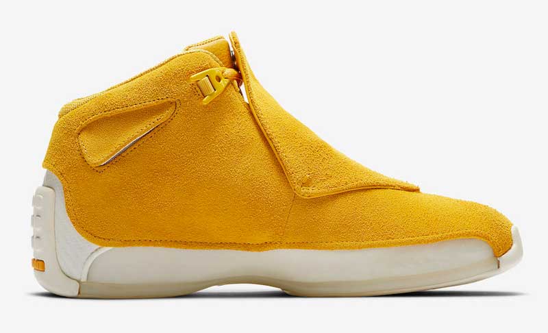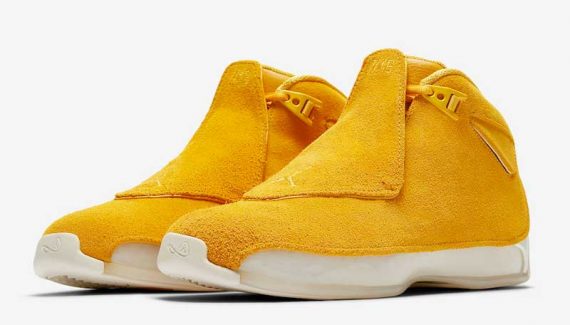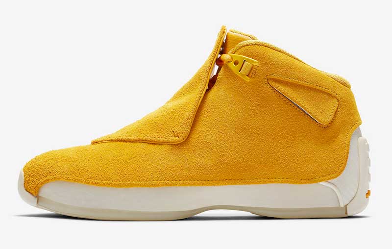 Voilà des teintes clairement inédites ! Le 15 septembre, la Air Jordan 18 va faire son retour avec une tige en daim et trois coloris unis très voyants. Au programme : orange, bleu et jaune. La recette est la même à chaque fois, avec un bloc de couleur posé sur une semelle translucide blanche.