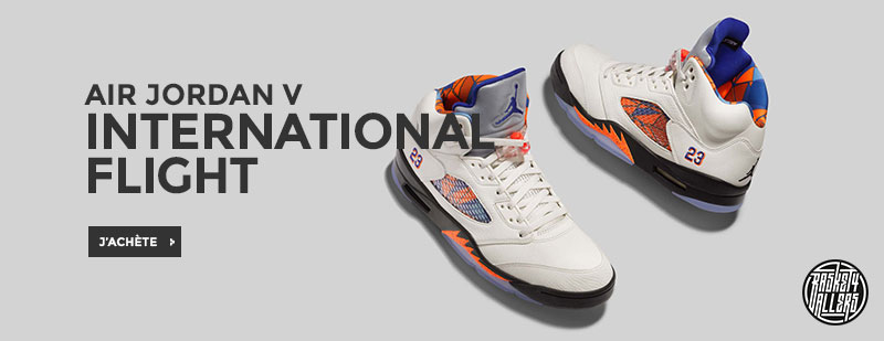 Commandez chez B4B la Air Jordan 5 International Flight inspirée du maillot que MJ porta lors d’un match à Barcelone et arborant un motif en mosaïque inspiré du street-art local.