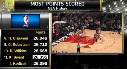 Il n’avait besoin que de 21 points pour dépasser John Havlicek, et Kobe Bryant a attendu la fin du match face à Chicago pour inscrire le fameux panier. Un shoot à une main pour 23 pts au total.