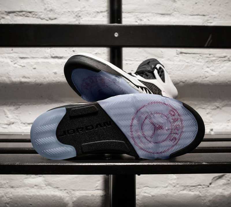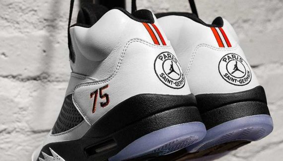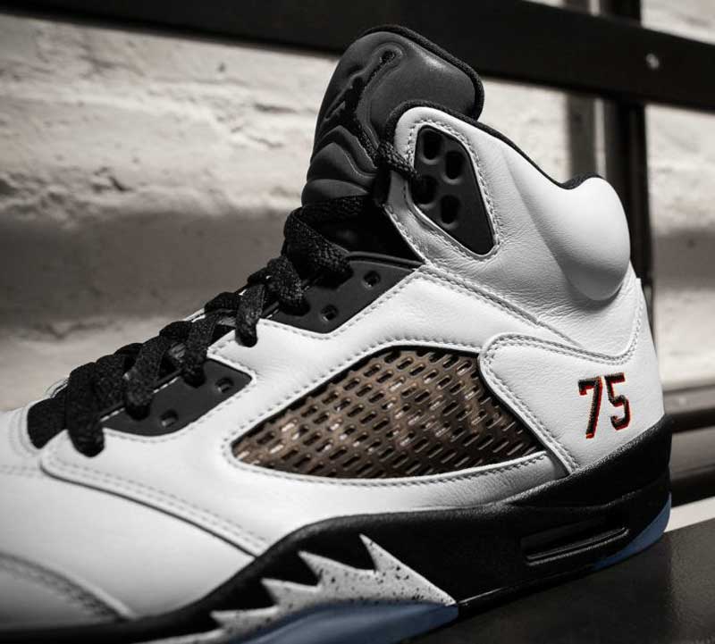 Mais quelques privilégiés vont avoir droit à une autre déclinaison de la Jordan 5. Et cette fois, c’est le blanc qui est à l’honneur. Les détails sont les mêmes que sur la paire noire, avec le 75, les accents rouges sur le talon ou le logo du club à travers la semelle translucide.