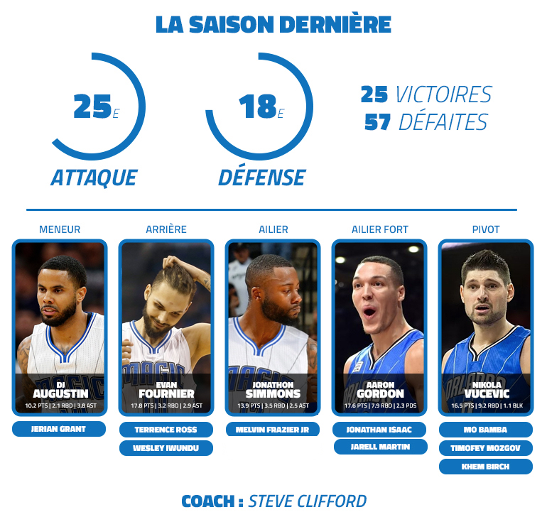 Mais d’autres questions se posent sur de nombreux postes. Annoncé comme “un ailier fort en attaque et un ailier en défense”, Jonathan Isaac doit se développer aux côtés d’un Aaron Gordon qui est aussi sur les deux postes. Quant au dernier choix de Draft de l’équipe, Mo Bamba, il arrive dans un effectif qui compte déjà Nikola Vucevic et Timofey Mozgov.