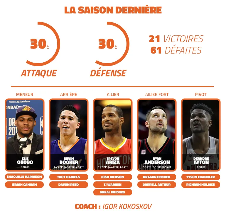 Devin Booker fait partie des meilleurs attaquants, et sur le plan personnel, il visera une place de All-Star. Il en a le potentiel mais ce sera évidemment très compliqué à l'Ouest. À ses côtés, on attend évidemment beaucoup de Josh Jackson, dont la polyvalence et l'activité sont des points forts.