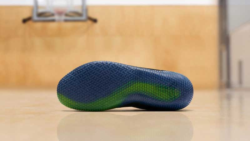Tout est dans la semelle amovible. Elle mélange les mousses React et Lunarlon. Vous pouvez même observer directement les deux mousses, puisque Nike leur a donné des couleurs différentes. Si React n’est pas la révolution annoncée, les sensations sont déjà bien meilleures que dans les Hyperdunk 2017. Le talon est souple et protège bien votre corps des chocs, tandis que c’est réactif à l’avant, tout en restant proche du sol. On pourrait presque penser qu’il y a du Zoom Air, alors que tout est en mousse avec un excellent court feel.