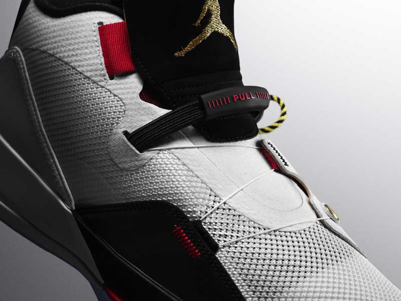 A l’exception de ce système de serrage, Jordan Brand n’en a pas dit beaucoup sur le reste de la chaussure. Probablement parce qu’elle s’inscrit dans la continuité, avec des poches Zoom Air sous le pied, et des matériaux qui semblent mêler mesh et cuir.