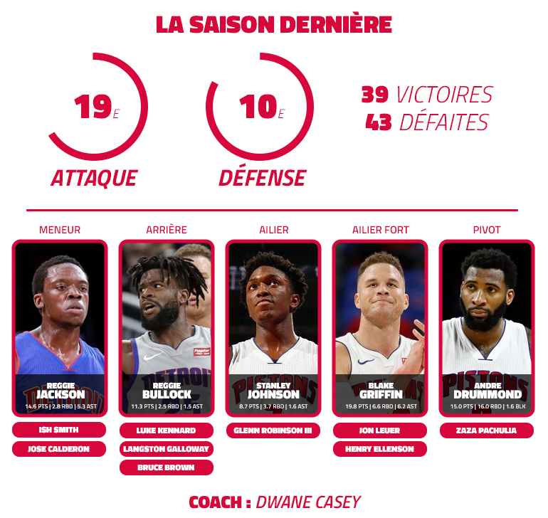 Pour ramener de l’enthousiasme chez les Pistons, Dwane Casey mise sur du jeu rapide, du “Drive & Kick” et davantage de shoot extérieur. Bloqués financièrement par les contrats de leur effectif, les Pistons n’ont toutefois pas fait de folies et leur progression devra donc se jouer en interne. Evidemment, les yeux se tourneront avant tout vers le “Big Three” local, en espérant que Reggie Jackson soit enfin apte à être la locomotive du jeu et que la paire Blake Griffin – Andre Drummond fonctionne sous le cercle. Les deux compères ont des atouts mais ils doivent se faire violence, notamment en défense…