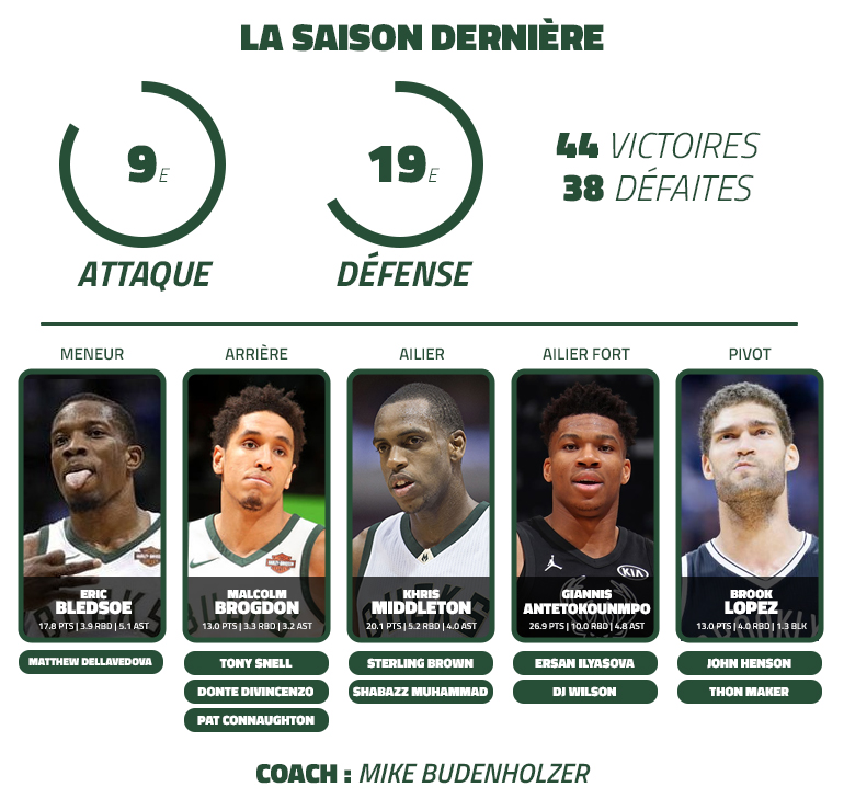 Il y a du boulot mais il y a surtout de quoi travailler. Mike Budenholzer a ainsi mis l’accent, lors de son entretien d’embauche avec ses nouveaux dirigeants, sur la volonté que “les talents se libèrent en défense”. Outre le “Greek Freak”, le coach va ainsi pouvoir s’appuyer sur le potentiel All-Star Khris Middleton et le bulldozer Eric Bledsoe, des “role players” intéressants comme Malcolm Brogdon, John Henson, Tony Snell, Thon Maker ou Matthew Dellavedova, mais aussi sur les recrues (Donte DiVincenzo, Ersan Ilyasova, Brook Lopez, Pat Connaughton), en phase avec la volonté affichée du club d’élargir le jeu.