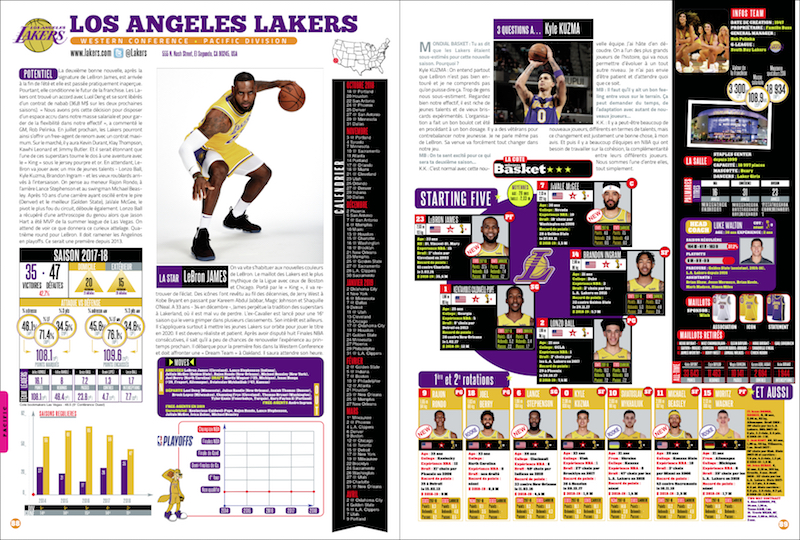 Pour chacune des 30 franchises, deux pages offrent un grand panorama avec la présentation du potentiel, un zoom sur la star, un questions-réponses et toutes les informations indispensables : photos des joueurs, fiches techniques complètes (taille, poids, âge, nationalité, numéro de maillot, draft, college, années d’expérience, record personnel, salaire, stats en carrière et stats du dernier exercice, sélections All-Star, titres NBA), chiffres de la saison 2017-18, courbe de résultats en saison régulière et en playoffs, position dans la division et la Conférence au fil des ans, mouvements de l’intersaison, calendrier du club, fiche du coach, staff technique, sponsor maillot, maillots retirés, front office, salle, masse salariale, valeur de la franchise, affluences moyennes, palmarès, maillots, mascotte, cheerleaders, records de franchise…