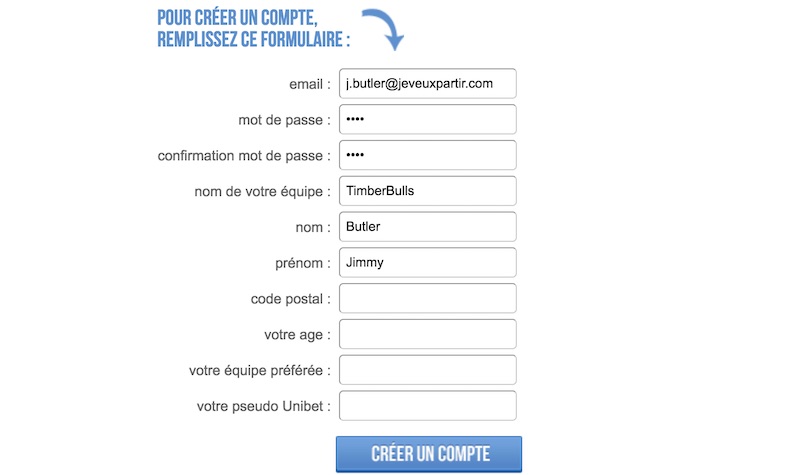 Remplissez le formulaire avec une adresse email valide, un mot de passe et le nom de votre équipe. N’oubliez pas d’indiquer votre pseudo Unibet pour qu’on puisse créditer votre compte de paris gratuits en cas de victoire au classement hebdomadaire. Cliquez sur Créer mon équipe.