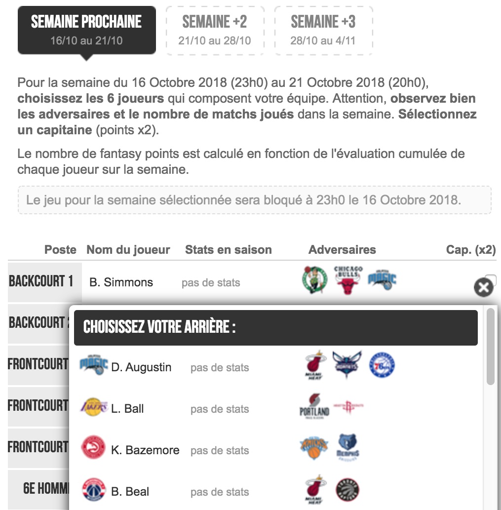 Dans la version hebdo, vous avez jusqu’à dimanche en fin d’après-midi pour créer votre équipe qui disputera les rencontres du dimanche soir au samedi soir. Vous avez la possibilité, en cas d’absence, de créer vos équipes avec trois semaines d’avance.