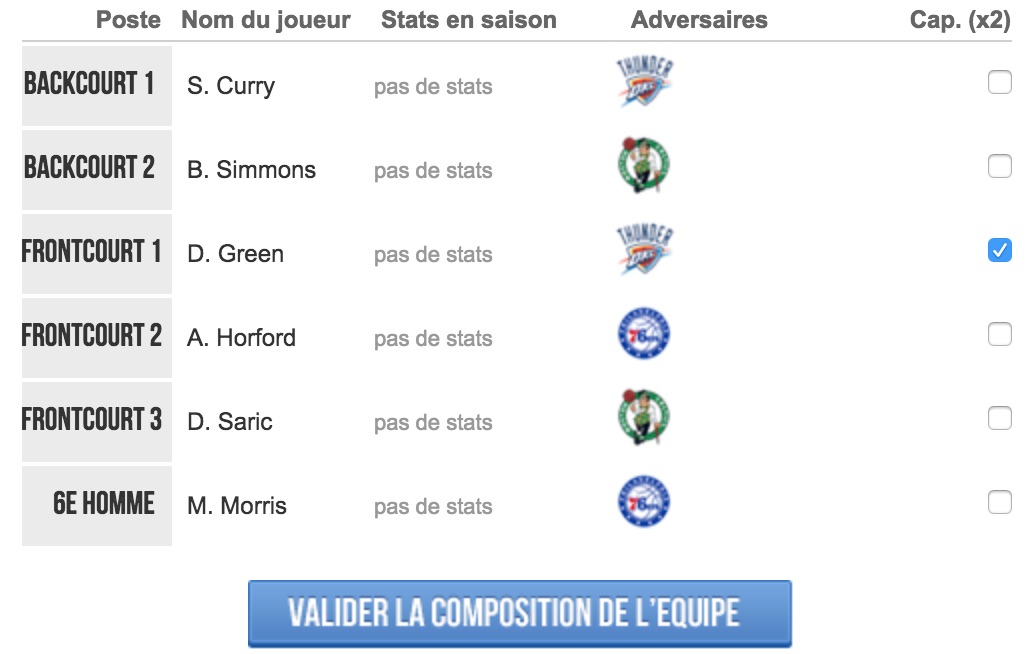 Il suffit de sélectionner une ligne pour valider un joueur. Une fois que vous avez sélectionné les six joueurs, n’oubliez pas de cocher un capitaine pour doubler ses points.