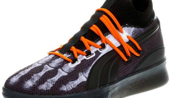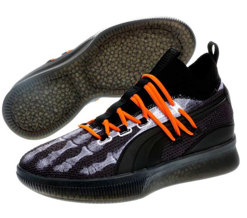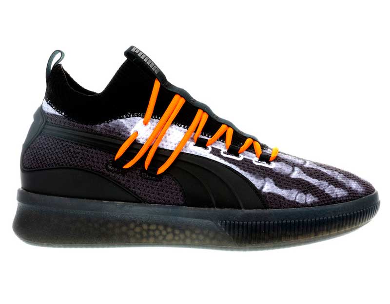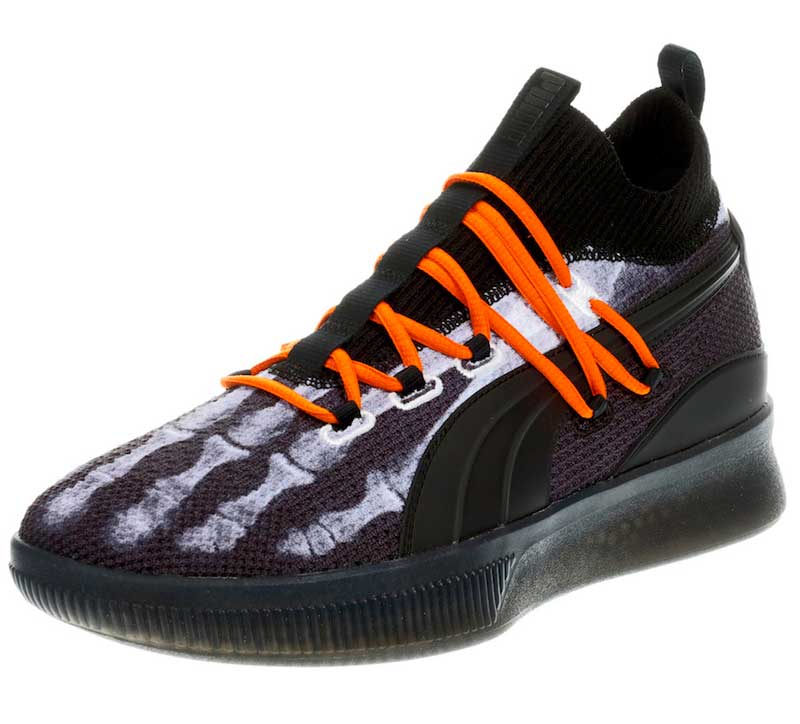 Pour fêter Halloween, la Clyde Court va se faire un peu plus discrète. Mais attention, elle n'oublie pas la fantaisie. Si la tige est noire, les lacets restent orange. Surtout, un motif reprenant une radiographie du pied recouvre toute la tige.