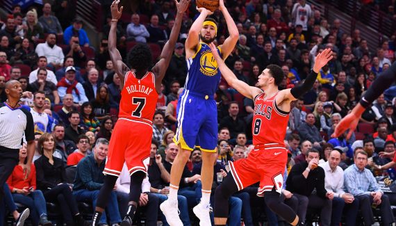 Les Bulls n’auront tenu que deux minutes, la faute aux trois premiers tirs primés de Klay, plantés en 1 minute 10, pour offrir 10 points d’avance aux siens (15-5). Kevin Durant et Stephen Curry prennent le relais et les trois hommes inscrivent les 24 premiers points de leur équipe. Quatre minutes plus tard, Klay remet ça avec trois banderilles en deux minutes qui font six pour lui, soit une de plus que son total depuis le début de l’année. Les Warriors mènent 44-28, leur arrière est à 22 points.