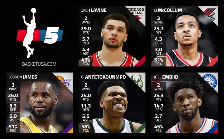 Pas facile de dégager un cinq majeur cette semaine. À l’arrière, Kyle Lowry, Kemba Walker, Luka Doncic et Damian Lillard étaient des candidats crédibles mais les 40 points de CJ McCollum face aux Bucks nous ont vraiment impressionnés. Et s’il a encore du déchet, le talent offensif affiché par Zach LaVine pour porter les Bulls est également à souligner.