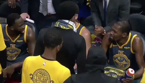 Ce qu'on ne sait pas, c'est que Kevin Durant a profité de la coupure avant la prolongation pour dire ses quatre vérités à Draymond Green. Au milieu, il y a Klay Thompson. On les voit se parler, le ton monte et finalement c'est DeMarcus Cousins qui prend Green à part pour le calmer, tandis qu'Andre Iguodala se charge de Durant.