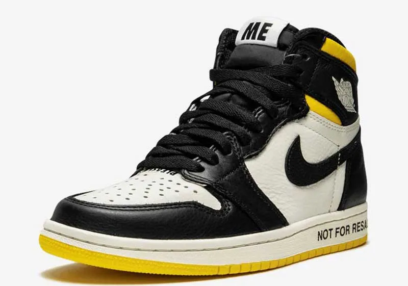 L'association blanc/noir/jaune n'est pas très originale en elle-même, mais ce sont les détails qui font la différence. Au fil de l'empeigne et de la semelle, on retrouve les inscriptions “Not for resale“, “Wear Me“, “No Photos“, “General Release” et “Please Crease.” Traduction : “Pas à revendre“, “Portez moi“, “Pas de photos“, “Sortie globale” et “Abîmez moi.”