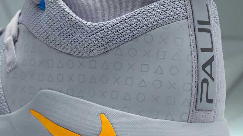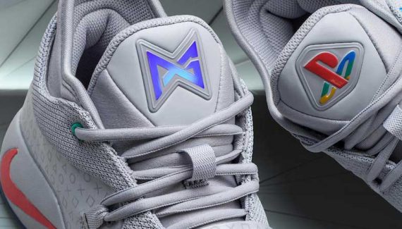 Les quatre couleurs de la PlayStation, mais aussi les quatre symboles de la manette, sont largement à l’honneur. Le prénom de Paul George est imprimé au talon, toujours dans l’esprit de l’identité visuelle de la console de Sony. Le tout est posé sur une semelle translucide.