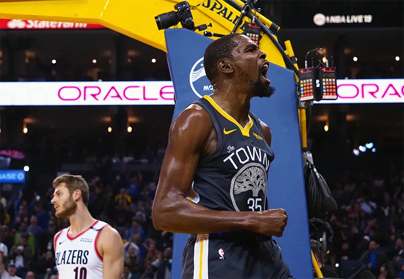 Alors que Lillard tente de réveiller son équipe, c'est toujours Durant qui enfonce le clou. Beaucoup plus actif que depuis le début de saison, il contre Lillard au cercle, convertit un alley-oop, avant de terminer une contre attaque par un dunk avec la faute suivi d'une explosion de détermination qui ravit tous les fans d'Oracle.
