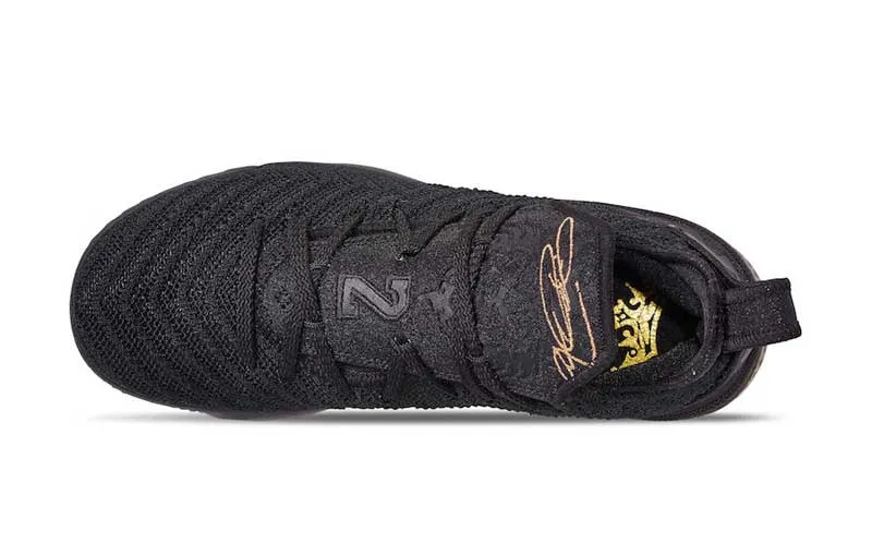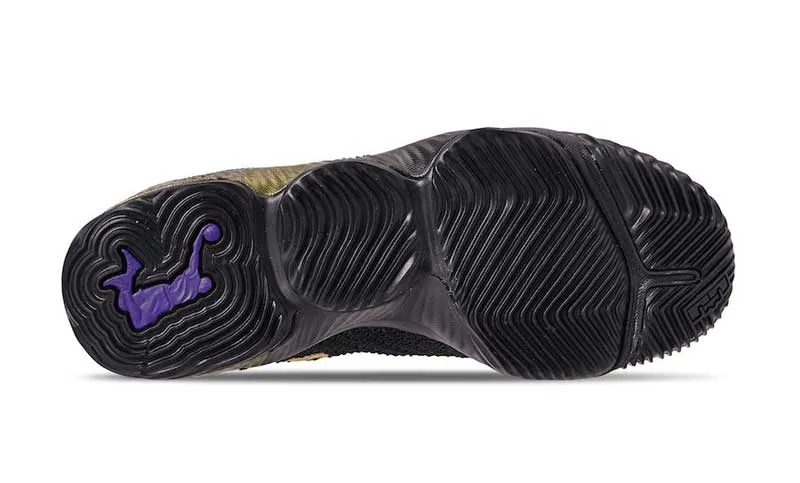 La teinte est plutôt simple, avec du noir à tous les étages, ou presque. Des touches dorées sont présentes au talon, sur la languette et pour la virgule placée à l’intérieur. La petite touche de violet sous le pied rappelle que c’est avec le maillot des Lakers qu’il faut désormais associer le roi.