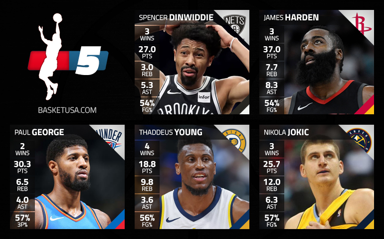 Avec trois victoires, deux “triple double” et un match à 50 points face aux Lakers, James Harden retrouve évidemment notre cinq majeur de la semaine. À ses côtés à l’arrière, Kyrie Irving, Stephen Curry et De’Aaron Fox étaient des candidats possibles, mais Spencer Dinwiddie a lui aussi réalisé une semaine parfaite avec des Nets qui restent sur cinq victoires d’affilée.