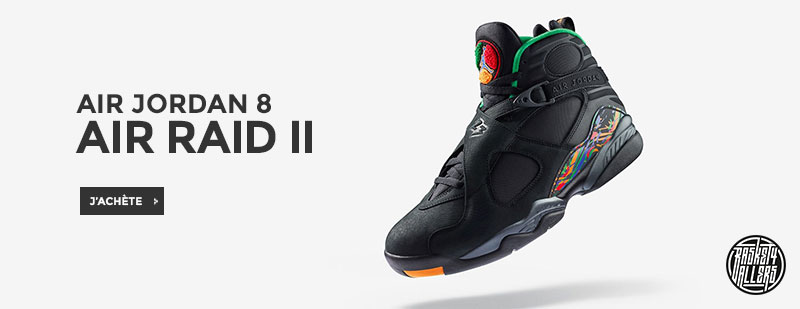 Commandez sur B4B la Air Jordan 8 Raid II hommage à la chaussure qui lui a inspiré sa double sangle croisée unique.
