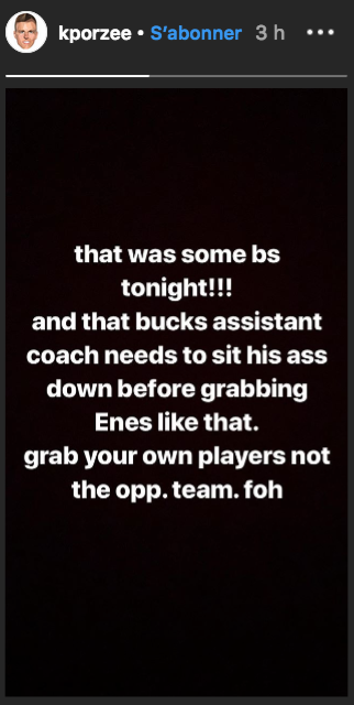 À noter enfin que durant l’altercation, l’assistant et ancien joueur des Bucks, Darvin Ham, s’est précipité entre les deux joueurs et a écarté Enes Kanter plutôt que son propre joueur. Une attitude qui a déplu à… Kristaps Porzingis. Le blessé des Knicks, dans une story Instagram, a crûment fait comprendre qu’il aurait préféré le voir attraper le “Greek Freak”.