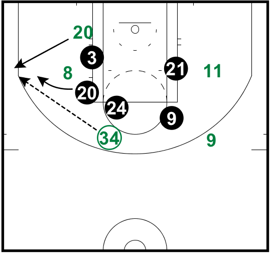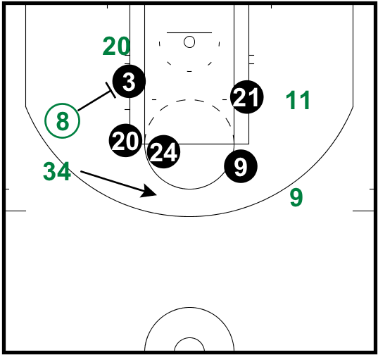 Daniels se démarque pour recevoir la balle. Parallèlement, Ray Allen traverse la raquette pour prendre sa place poste bas.