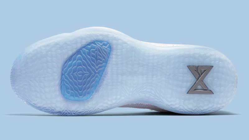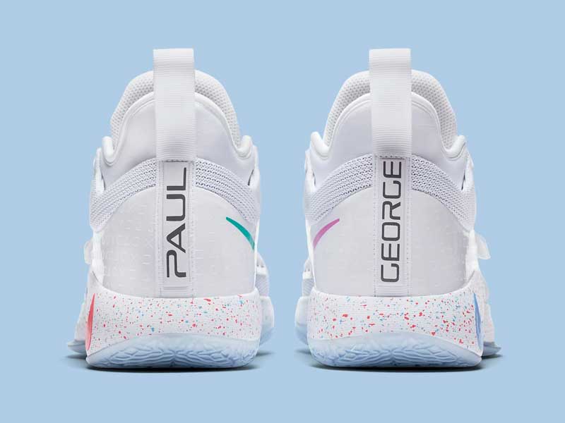 Les symboles de la manette sont également posés ton sur ton au niveau de l’empiècement arrière. Le nom de Paul George est imprimé au talon dans la police de caractère typique de la console.