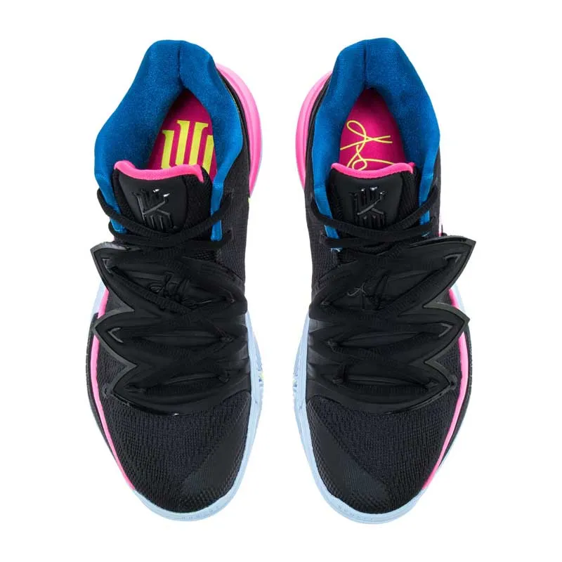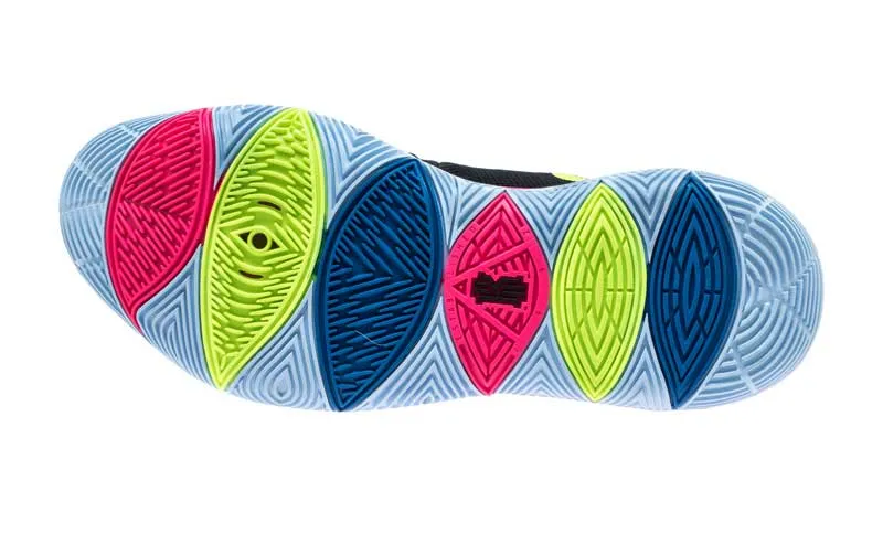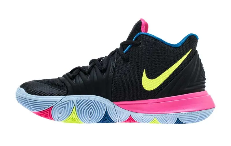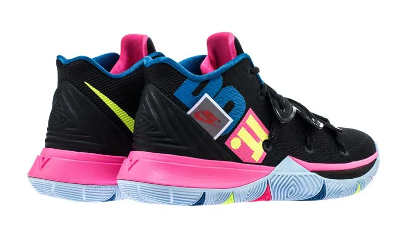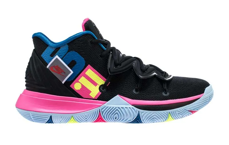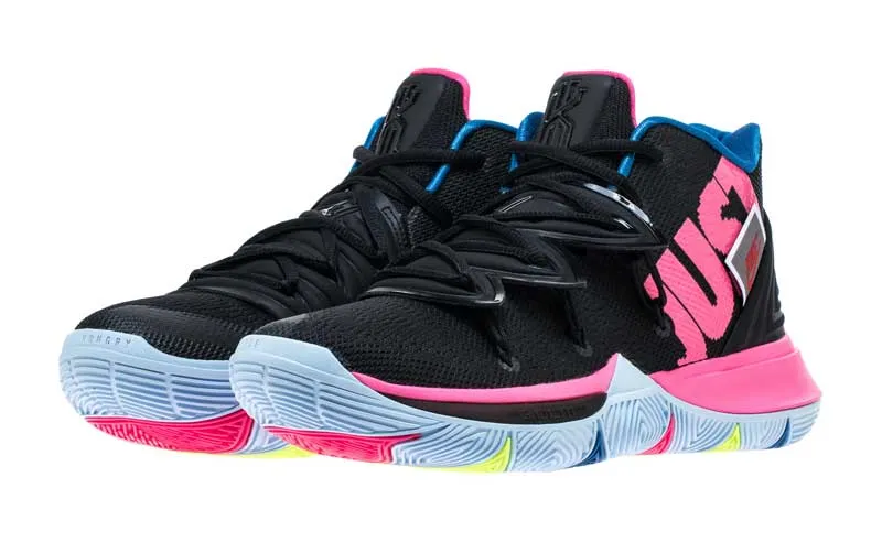 L’expression sera le thème central du coloris de la Kyrie 5 annoncé pour le 15 janvier. Sur une base noire, les trois mots apparaissent en rose, bleu et jaune. Sur le talon, une étiquette apparaît aussi avec le logo original de la marque.