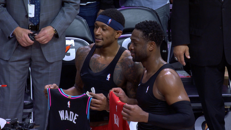 C’est presque devenu un rituel, lorsque D-Wade échange sa tunique avec la star de l’équipe d’en face, célébrant les derniers instants d’une carrière bien remplie, à sa manière. L’échange du soir a été l’occasion pour Bradley Beal de témoigner de toute son admiration envers un joueur emblématique de la ligue depuis 15 ans, et la fameuse Draft de 2003.
