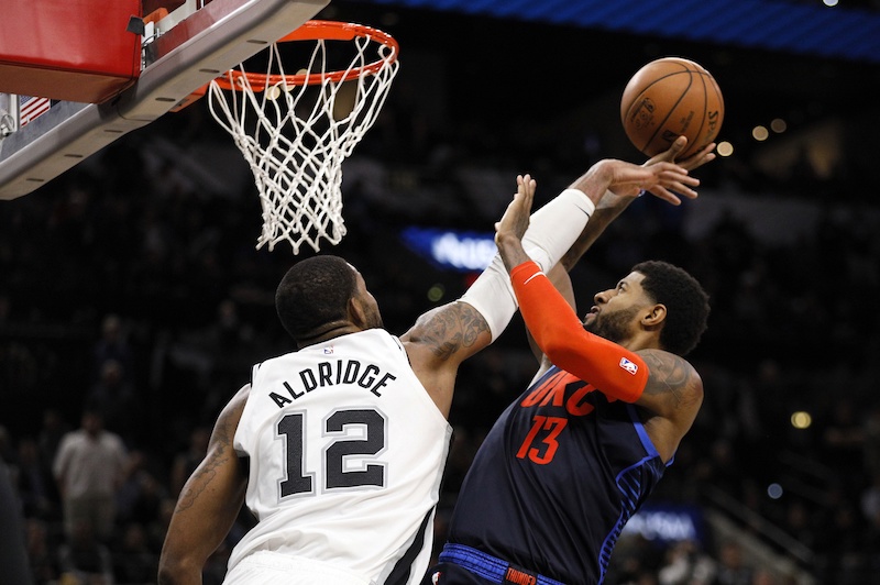Si le Thunder continue sur sa lancée, les Spurs retrouvent leur lucidité. Deux stops défensifs, deux points d’Aldridge à l’intérieur, et un 3-points de Patty Mills leur donnent quatre points d’avance (139-135). Alors que LaMarcus Aldridge bat son record de points sur un match, OKC s’accroche. Un rebond offensif de Westbrook accouche d’un dunk de Steven Adams qui remet les deux équipes dos à dos (141-141). Avec 25 secondes à jouer, DeMar DeRozan décide alors de jouer son un contre un face à Paul George… plutôt que de servir Aldridge. Mauvaise décision ! George reste dans son short et le tir forcé de l’ancien Raptor échoue sur le cercle. Double prolongation !