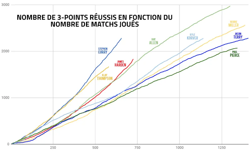 Même au rythme actuel de cinq tirs à 3-points réussis par match, il faudra encore 138 matchs de saison régulière (puisque les records de ce type ne comptent pas les matchs en playoffs) pour rattraper Ray Allen et ses 2 973 tirs à 3-points. S’il ne se blesse pas et qu’il ne perd pas la cadence, Stephen Curry pourrait donc y arriver dans deux saisons.