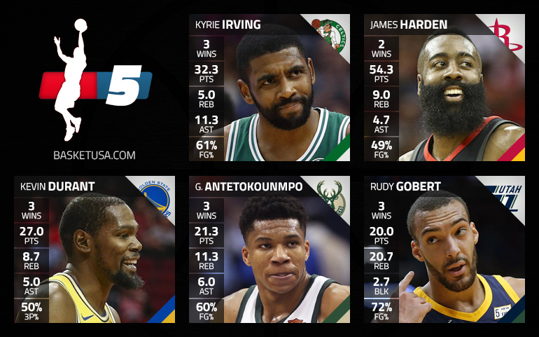 Avec 54.3 points de moyenne sur la semaine (!), James Harden est une évidence dans notre cinq. Beaucoup de candidats étaient là pour l’accompagner : D’Angelo Russell, Donovan Mitchell, Damian Lillard, Buddy Hield ou Kemba Walker. Finalement, on a hésité entre Stephen Curry et Kyrie Irving mais ce dernier a été particulièrement propre lors de ses dernières sorties, avec une belle adresse et surtout une bonne alternance entre ses capacités de scoreur et de la création.