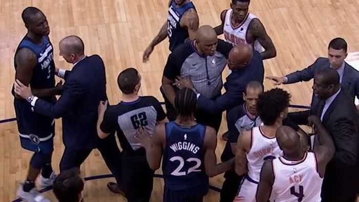 Au départ, un coup de coude appuyé de Dieng sur le visage de la star des Suns après un rebond. Des mots sont échangés, et Booker touche le visage de l’intérieur des Wolves. Les esprits s’échauffent, et les arbitres décident d’expulser les deux.