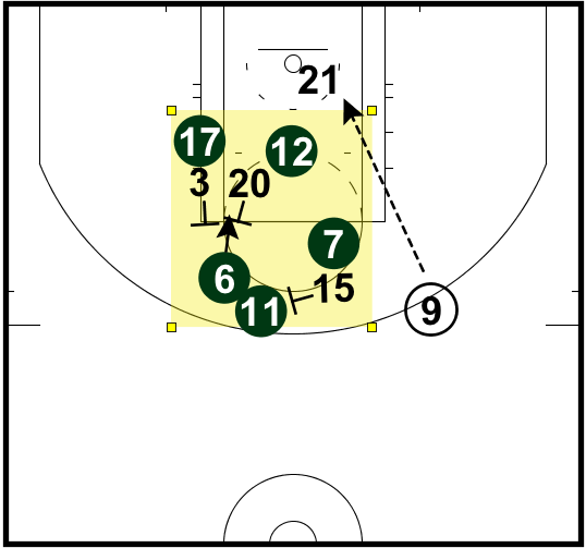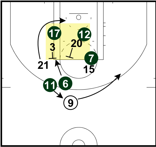 A peine Boykins a-t-il contourné son coéquipier qu’il est victime d’un écran de Bonner en tête de raquette. Bogut est toujours coincé par les 2 écrans. A ce moment là, 8 joueurs sont positionnés en tête de raquette (zone colorée sur l’image ci-dessous), et c’est la confusion la plus totale.